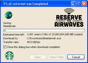 Accessing the wifi in Starbucks presents you with the .gif above when a user attempts to connect. Internet connectivity is then throttled down for the initial minutes of connectivity.